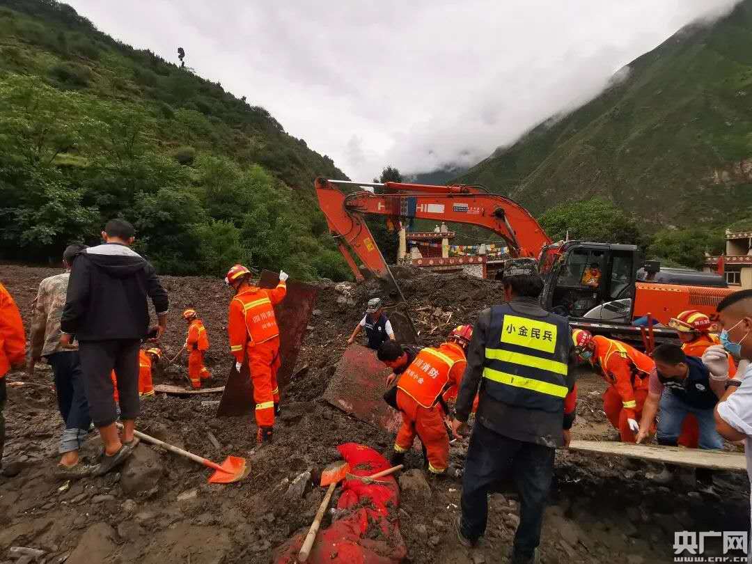 干部群众正在搜救(央广网发 小金县供图) 此次灾害造成灾害堆积体达50000余方,致使国道350(小金-丹巴)全部中断,预计7月10日恢复通行;冲毁耕地50余亩,苹果、核桃、花椒等经济林木1300余株,国道冲毁200余米,电力、通信杆线冲毁20余根,车辆损毁3辆,经济损失正在进一步核实中。