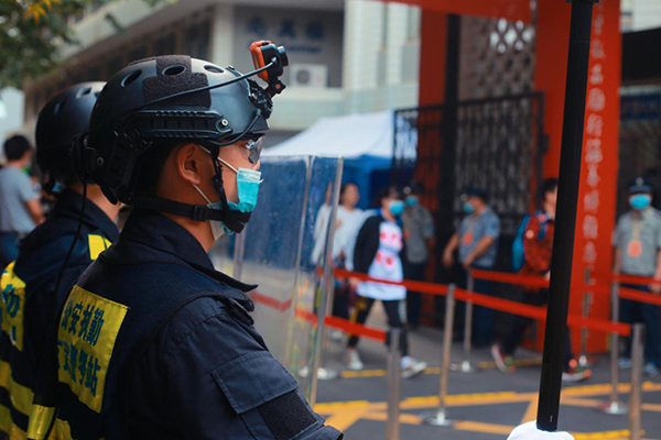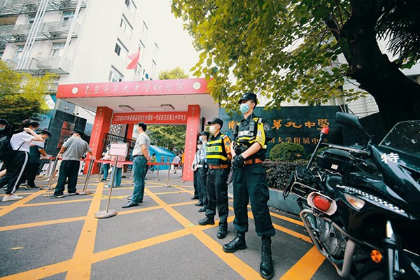 7月9日16时40分,随着各个考场考试结束铃声的响起,2020年江苏高考正式结束。受新冠肺炎疫情影响,今年高考比往年推迟了整一个月。为做好本次高考安保工作,南京警方未雨绸缪、全警动员,提高巡防等级,全力做好社会面巡防工作。同时,在全市30个考点门前设置“高考服务站”,执勤警力在考点门前划出一定范围的警戒区域,加大考点门前的治安秩序管理;不仅如此,警方还将“服务窗口”前移,在各考点门前搭设临时身份证明办理服务点,为考生开辟绿色通道,确保考试顺利进行。 据统计,截至7月9日下午,南京110接警平台共接到涉及高考警情270余起,均妥善处置。7月8日下午,为减少交通噪音对高考外语科目考试的干扰,市公安局交警支队于当天14时50分至15时30分,对主城区16处考点、周边29条道路实行了临时交通管控,提前分流机动车及噪音较大的非机动车,为考生们营造了良好的考试环境。 考前:各警种通力配合 全力保障高考顺利进行 为做好本次高考安保工作,市公安局专门成立了高考应急指挥领导小组,指导协调全局高考期间安全保卫工作。根据市公安局党委部署,7月3日上午,市公安局召开会议,部署高、中考安保相关工作,提出了8个“措施到位”的工作要求。7月6日上午,省公安厅副厅长、副市长、市公安局局长常和平深入南京航空航天大学附属高级中学、市第九中学考点检查指导高考安保工作。 “我们在每个考点都设置了一个公安综合护考服务站、一辆武装护考巡逻车、一组爱心保障应急铁骑和一条交通保障绿色通道,用这‘四个一’为考生保驾护航。”市公安局内保支队支队长范志愚介绍。
