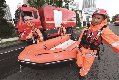 十日起,南京消防救援支队陆续在南京全市设置二十九个前置备勤点,确保南京江河湖库堤防安全。图为昨日,特勤大队一站和水域救援大队消防指战员携带大功率手抬机动泵、皮划艇、冲锋舟不间断巡防。 方思伟文 万程鹏摄