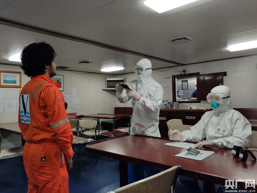 厦门边检民警登轮开展人证对照工作(央广网发 陈东杰摄) 据悉,该轮从澳大利亚波特兰出发,历经14天到达东渡口岸。这批进口种牛数量大、品种多,总价值超过4400万元,入境后将迅速转移至位于厦门市翔安区大帽山的隔离检疫场,待隔离期满检疫合格后,发往全国各地牧场用于存种培育,有助于改良国内肉牛奶牛品质,辐射带动牧区牧民增收,促进国内发展优质畜牧业。