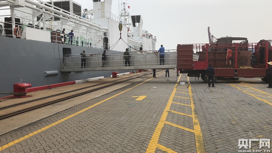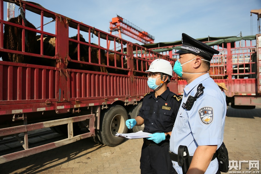 现场接卸活牛(央广网发 祝婕女摄) 针对该轮载运时间长、搭载人员数量多、口岸限定区域接卸货车多的实际情况,厦门东渡出入境边防检查站提前核查船舶轨迹,筛查船员信息,实时与海关互通信息,协助做好现场围栏设置和场所消杀,着力降低疫情输入风险。该轮靠泊完成检疫程序后,又迅速派出3名骨干民警,穿戴高等级防护装具,登轮开展人证对照等边防检查工作,并第一时间办理入境边检手续和行政许可审批手续,最大程度压缩减少船舶候检时间,避免活牛因高温中暑造成死亡,确保疫情不入、卸货不缓。 |