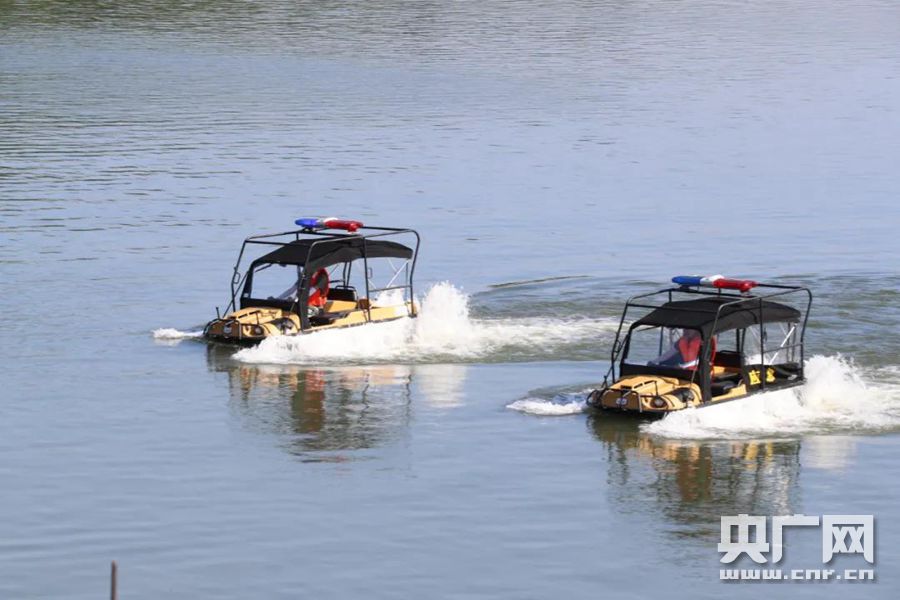 8乘8全地形水陆两栖车(央广网发 吉林省应急管理厅供图) 央广网吉林7月23日消息(记者苑竞玮 通讯员李成才)目前,吉林省已进入主汛期。为了有效应对可能发生的汛情,吉林省应急管理厅近日在吉林市星星哨水库举行了防汛抗洪水上救援演练。 本次演练模拟场景为,2020年进入主汛期以来,吉林省持续降雨,饮马河永吉县万昌镇段堤防出现决口险情,部分公路、桥梁设施受到不同程度的损坏,附近村屯受灾严重,部分民房倒塌、群众被洪水围困,人民群众的生命财产安全受到严重威胁。吉林省防汛抗旱指挥部对饮马河流域启动防汛Ⅲ级应急响应,调动省防汛机动抢险队和省第二松花江防汛机动抢险队的55名救援人员奔赴灾害发生地域,组织转移营救被洪水围困群众。