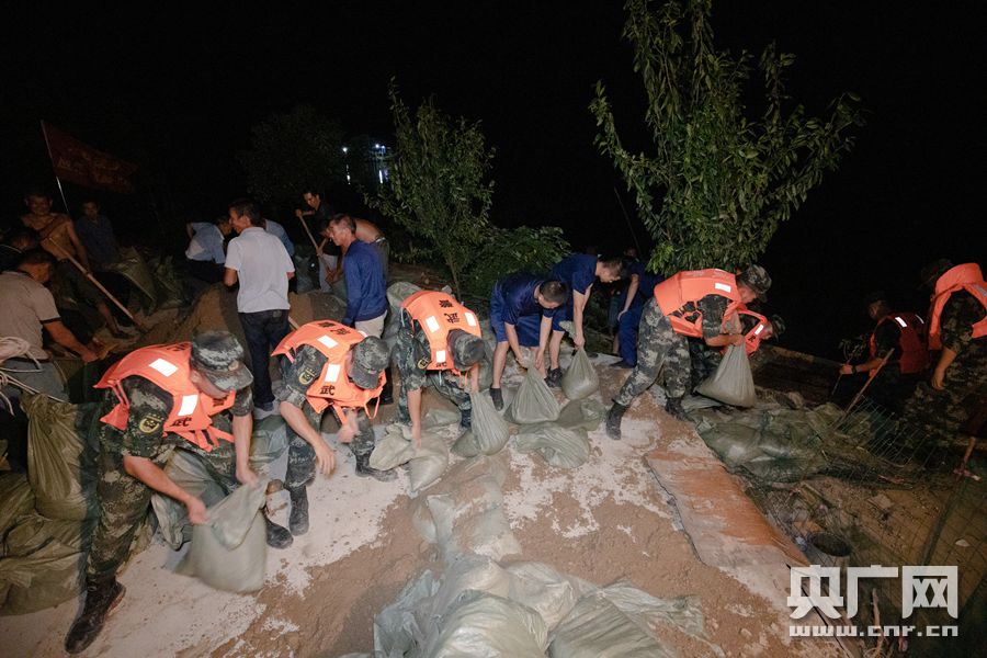 武警官兵连夜接力搬运沙包(央广网发 通讯员供图)