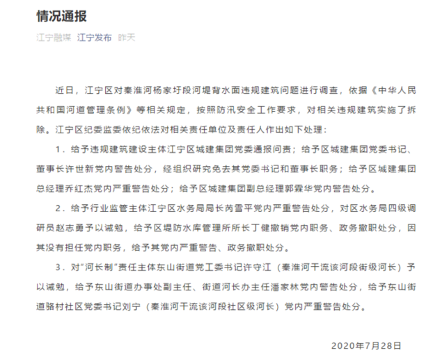 新华网南京7月29日电(戚轩瑜)7月28日晚,“江宁发布”微信公众号发布关于秦淮河杨家圩段河堤背水面违规建筑问题的情况通报。 通报内容称,近日,江宁区对秦淮河杨家圩段河堤背水面违规建筑问题进行调查,依据《中华人民共和国河道管理条例》等相关规定,按照防汛安全工作要求,对相关违规建筑实施了拆除。 江宁区纪委监委依纪依法对相关责任单位及责任人作出如下处理: 1.给予违规建筑建设主体江宁区城集团党委通报问责;给予区城建集团党委书记、董事长许世新党内警告处分,经组织研究免去其党委书记和董事长职务;给予区城建集团总经理乔红杰党内严重警告处分;给予区城建集团副总经理郭霖华党内警告处分。 2.给予行业监管主体江宁区水务局局长芮雪平党内严重警告处分,对区水务局四级调研员赵志勇予以诫勉,给予区堤防水库管理所所长丁健撤销党内职务、政务撤职处分,因其没有担任党内职务,给予其党内严重警告、政务撤职处分。 3.对“河长制”责任主体东山街道党工委书记许守江(秦淮河干流该河段街级河长)予以诫勉,给予东山街道办事处副主任、街道河长办主任潘家林党内警告处分,给予东山街道骆村社区党委书记刘宁(秦淮河干流该河段社区级河长)党内严重警告处分。