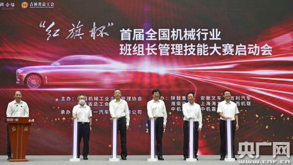 “红旗杯”首届全国机械行业班组长管理技能大赛启动仪式(央广网记者 刘源源 摄) 记者注意到,这次大赛是全国机械行业班组长首次同台竞技,为广大班组长提供了展示才能、交流经验、切磋技艺的宝贵机会。大赛通过中国机械工业互联应用服务平台以及中国机械工业现代化企业管理示范基地,线上线下同步展开,分为预选赛、复赛、决赛三个阶段。预选赛积分综合排名前2000名进入复赛,复赛成绩综合排名前200名选手进入决赛。决赛现场设在中国一汽,赛程包括理论考试和实操模拟测试等。为表彰先进、弘扬工匠精神,大赛还设个人奖和组织奖。个人获奖选手将授予“机械行业优秀班组长”称号,并给予物质奖励。大赛整体设计上,中国一汽贯彻建设知识型、技能型劳动者大军,弘扬劳模精神和工匠精神的总体要求,紧紧围绕企业末端管理“夯基固本”,着力培养“精生产、善管理、懂经营”的高素质复合型班组长队伍。 一汽集团党委副书记秦焕明表示,一汽将以本届“红旗杯”首届全国机械行业班组长管理技能大赛为契机,不断提升班组长管理技能和水平,培养造就更多的班组长管理精英,继续加强与全国兄弟企业的密切合作,共同为促进中国机械行业高质量发展作出应有贡献。