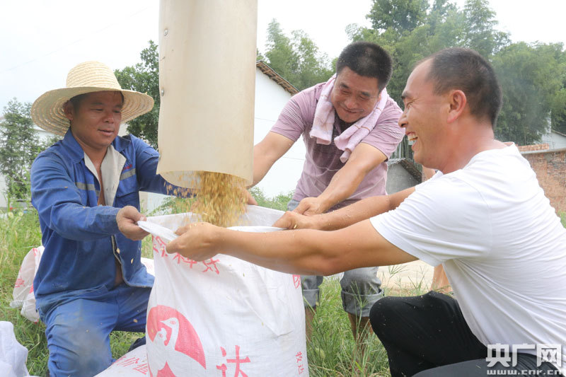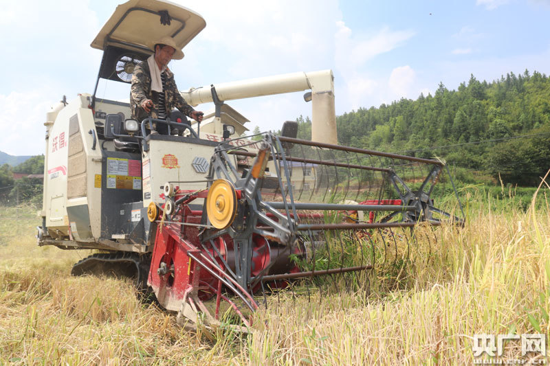 收割机作业中(央广网发 通讯员梁紫微 摄) 眼前看到的这片金灿灿的稻田,在一年前,多半处于撂荒状态。因地理位置有点坡度,农田灌溉需要挖路引水,培泥蓄水,导致很多农户直接放弃了种植。为积极响应中央“六保”“六稳”的号召,把饭碗端在自己手里,同时解决土地撂荒问题。返乡创业青年周汉君,通过以谷代租的方式从农户手中流转了这片土地,建设高标农田,种植再生稻。 做出这个决定时,周汉君心里也有很多担忧。再生稻收成到底如何?300多亩农田管理起来是否会有难度?作为乡里第一个“吃螃蟹”的人,周汉君知道,既然决定了,就不能退缩,不能辜负老百姓的信任,一定要把田种好,给村民树立信心!除了田埂培泥这些工程量大的活计,放水、察看实时长势等周汉君都尽量亲力亲为,或者手把手教会做事的伙计熟练为止。从4月初播种到现在一次收割,看着小小秧苗长高、出穗,整个过程中,周汉君收获的不仅是丰收的喜悦,更是带领乡亲们共奔致富路的信心和希望。