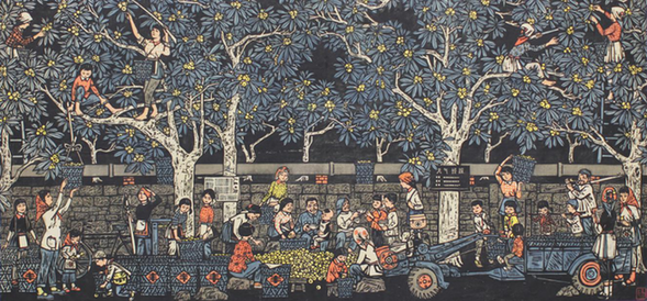 版画 《五月枇杷满树》 杨明义 据悉,此次展览在馆藏作品中遴选出创作于上个世纪五六十年代至今的版画和中国画作品120幅,将分为砥砺奋进、美好生活和绿水青山三个版块,主要立足于对馆藏中国画和版画经典美术作品的梳理,遵循时代、历史和美学的线索,见微知著,全方位地呈现社会奋进、祖国河山和人民生活的各个方面。 在江苏省美术馆馆长徐惠泉看来,其中有些作品以大尺幅、大构图着眼于表现水利建设、铺路架桥、航天工程等宏大叙事;有些则以小见大,聚焦于农家丰收、庆贺新居、老有所乐等平凡瞬间;有些则直抒胸臆,记录于松竹林茂、烟云缥缈、鸟啼蝉鸣等生态景观,共同勾勒出社情人文的时代变迁。