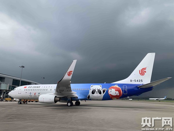 冬奥主题彩绘飞机“冬奥冰雪号”首次亮相广州(央广记者周羽 摄) 国航“冬奥冰雪号”主题彩绘飞机得名源于北京2022年冬奥会和冬残奥会吉祥物“冰墩墩”和“雪容融”,各取首字“冰”“雪”既体现了冬奥会冰雪运动特点,又紧扣“纯洁的冰雪激情的约会”美好愿景。澄澈的渐变蓝和通透的白色覆盖机身,犹如蓝天与冰雪交相辉映,充满美好寓意的“冰墩墩”“雪容融”跃然机上。