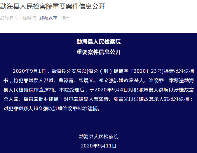 图为官方通报。勐海县委宣传部官方微信公众号截图 通报称:2020年9月1日,勐海县公安局以[海公(刑)提捕字〔2020〕23号]提请批准逮捕书,将犯罪嫌疑人洪峤、曹泽青、张晨光、祁文强涉嫌故意杀人、盗窃罪一案移送勐海县人民检察院审查逮捕。 勐海县人民检察院受理后,于2020年9月4日对犯罪嫌疑人洪峤以涉嫌故意杀人罪、盗窃罪批准逮捕;对犯罪嫌疑人曹泽青、张晨光以涉嫌故意杀人罪批准逮捕;对犯罪嫌疑人祁文强以涉嫌盗窃罪批准逮捕。 此前,勐海县公安局于8月4日通报称,李某月从江苏南京到达云南勐海后去向不明。初步查明,犯罪嫌疑人洪某与张某光、曹某青在南京合某,张某光、曹某青前往勐海县于7月9日晚将李某月诱骗至该县城郊外的山林中杀害并埋尸。 (杜潇潇) |