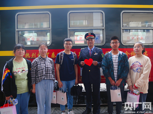 列车工作人员为大学生佩戴上大红花(央广网发 通讯员张雁南 摄) “因为今年疫情的原因,让我萌发了学医的念头,最终也如愿被西安医学院录取了。”当被问到高考志愿是如何选择时,家住马蹄湾镇的梁欣瑶平静地说道,“当学有所成时,我还会回到秦岭,用学到的知识报效祖国,为家乡的建设贡献自己的力量。” “向叔叔,梁佳走之前写了封信让我带给您。”临近略阳车站,封清杰找到向宝林车长,递上了一张心形卡片。家在白水江镇的梁佳今年也考上了西安外国语大学,原本和同学约好再坐一次小慢车,可因为临时有事便提前去了西安,临走前,她便托同学给向车长带来一封信。