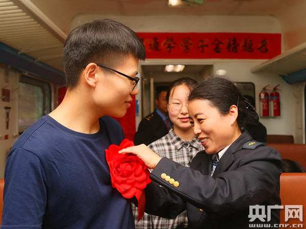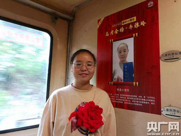 公益慢火车的乘客车雅玲如愿考上大学(央广网发 通讯员张雁南 摄) “孩子们,今年我们小慢车的通学学生里,有7人考上了大学,现在让我们揭开‘高考金榜’,一起来看看他们都是谁。”列车从马蹄湾站开车后,6063次列车长向宝林一边说着一边挥手掀开了红绸,只见一张红纸金字的“高考金榜”展现在所有人眼前,上面7名“准大学生”拿着录取通知书喜笑颜开的照片吸引了所有人的注意。 “封清杰考上西安工业大学,高璇考上了西安外国语大学,梁欣瑶被西安医学院录取……”向宝林车长念着榜单,受邀来到车上的5名“准大学生”依次走上前,列车工作人员为他们佩戴上大红花,“通学车厢”还为他们准备了钢笔、笔记本等学习用品作为礼物。最让孩子们暖心的是,列车工作人员发现他们全都考上了西安的院校,便特意为他们办了西安的“长安通”乘车卡,初到西安,孩子们坐地铁、公交就一下子方便了很多。最后,封清杰、车雅玲作为代表,还对车厢内的学弟学妹们讲述了高考心得、传授了学习经验,并送上了自己对弟弟妹妹们最美好的祝愿。