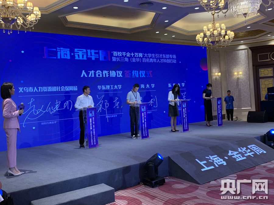 活动签约现场(央广网记者 张国亮 摄) 据介绍,“百校千企十万岗”大学生引才东部专场暨长三角(金华)百名青年人才科创行动旨在进一步深化上海、金华两地交流合作,提升开放协同创新能力,推进金华全方位融入长三角一体化发展。除了城市推介,活动还邀请了50家金华市重点企业、30所长三角地区重点高校和10家国内人力资源龙头企业参加此次活动。 “义乌是一座爱才惜才,没有围墙的开放包容之城。我们有正在建设的双江湖高校产业园区,有高含金量的人政策,有‘揭榜挂帅’的柔性引才机制,有高能级的产业平台。”活动现场,金华义乌市委组织部长何若伟也向全球人才发出了诚挚的邀约,分享了大学生在义乌创业的生动故事。 近年来,义乌在全国率先出台采购商人才政策,打破学历、资历和职称限制,评选了首批64名金牌、银牌采购商人才,并配套人才住房、子女入学、出入境、仓储物流、金融支持等“一揽子”政策。出台重点领域人才专项政策,实施百名优秀教师引进计划、千名一线教师进修计划、千名骨干教师培养计划、卫生领域高层次人才引进计划等。成立义乌市人才发展集团,打造双江湖科教园区、院士之家、人才创业园、产业工程师协同创新中心等高能级平台,不断做大人才“蓄水池”。以人才“一张床”改革为牵引,构建“一周免费住、三年半价租、购房直接补”人才住房体系。今年1-8月,新增首次来义大学生2.5万名,同比增长50%以上。 活动现场,金华、义乌两地与上海杨浦区及部分高校签订人才合作协议。据悉,此次活动是“2020上海-金华周”系列引才活动之一。“2020上海-金华周”以“接轨上海·创赢未来”为主题,重点在人才科技对接、重大项目引进、金华文化旅游推介及长三角内陆城市合作交流等方面谋求新突破新成效。“2020上海-金华周”期间,除此次活动外,还将举办长三角G60金华(上海)科创中心和人才大厦揭牌、长三角内陆开放联动发展论坛等活动。 |
