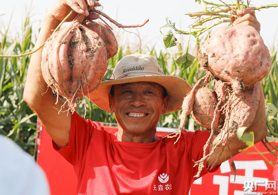 9月20日,在天津市武清区豆张庄镇周立营村田野里,一场“欢庆丰收 助力乡村振兴”为主题的庆祝农民丰收节活动正在举行,村民手举着刚刚从地里挖出的烟薯(央广网记者 刘阳 摄)