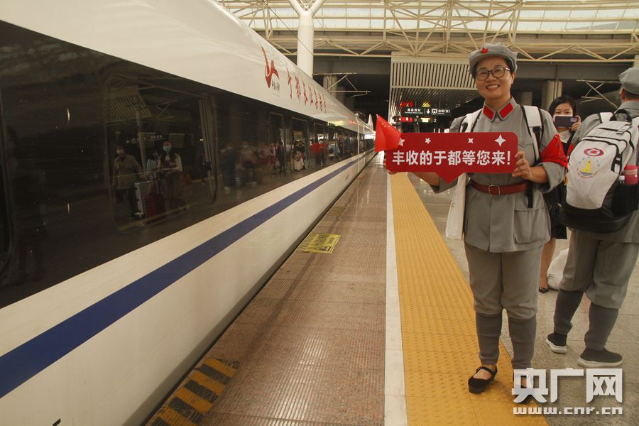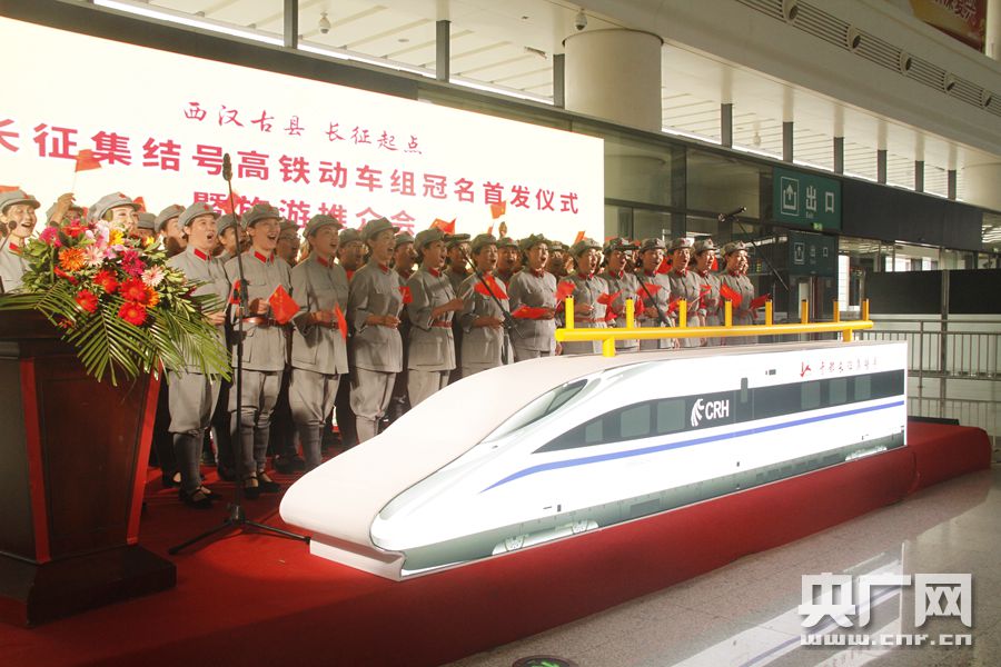 “于都长征集结号”冠名仪式现场 (央广网发 通讯员供图) 央广网南昌9月27日消息(记者谢元森 通讯员方名荣)9月26日16:52时许,冠名为“于都长征集结号”的G5065次列车在“英雄城”江西南昌举行首发仪式,该趟列车由萍乡北至福州往返,途径南昌西、吉安西等14个站点,19:10过于都站,23:31到达终点站。