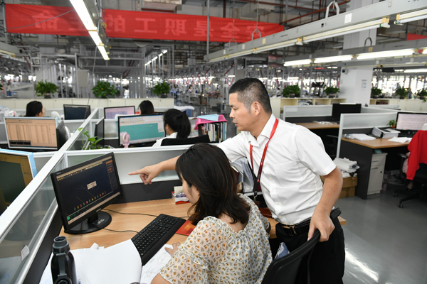 郭军伟指导徒弟肖尔纯电脑制版 荣誉越多,责任越大。郭军伟现在已经是江苏红豆实业股份有限公司衬衫厂的技术科长、高级版师,但在他眼里,荣誉只代表过去,作为扎根一线的技术工人,需要不断挑战自己,与时俱进实现自我转型,才能持续领跑。 当他意识到互联网时代电脑制版终将发展为主流并逐渐取代甚至超越手工制版时,主动参加了公司组织的进修学习。他克服学历低、不会操作电脑的劣势,最终系统掌握了电脑制版的技术,并结合手工制版的精细化与电脑制版的效率化,摸索出了高效制版的技术,以前制版需要半天,现在半个小时就能完成。 当他意识到传统工艺在满足个性化需求服务方面的不足时,他提出互联网时代只有不断改进工艺,为产品注入个性化创造理念和情感温度,才能展示衬衫艺术的生命。 为了实现突破,郭军伟常常利用周末到红豆大学充电,结合自身需求选修针对最新流行款式、面料、色彩的培训课程,通过上网查找资料和出差的机会在设计面料、颜色上不断创新。 每次供应科从国外进口衬衫回来,他都第一时间把样衣拿来反复研究,将前片、后片、衣领、袖子……化整为零拆分拼接,像研究艺术品一样琢磨不同风格的版型优势,经过反复对比试验,成功将衬衫单一版型改良为商务版、修身版,休闲版、时尚版,从而满足了不同年龄、层次、身型的个性化、多元化需求,为企业占领市场、赢得顾客作出了贡献。 爱“捣鼓”的“多面手” 大巧破难。除了在制版领域精益求精,近年来,郭军伟还在技术创新上小有成就。为提高车间生产效率,他以近乎痴迷的执着在车间和工作室“捣鼓”各种生产小工具,累计已达8种。 制版前准确测量面料缩水率,对提高版样精准度非常重要。为提高测量效率,他想出用一个50x50公分的玻璃板作为测量面料缩水率的标准工具。“玻璃板中间设置了很多排列规则的小气孔,这样压上去可以将玻璃板和面料之间的气泡排空,保证面料的平整度。非水洗面料,标注好经纬度后直接拿去用蒸汽熨烫一下,但蒸汽时候不能抽风,这样测出的数值更加精准;水洗面料,需要水洗一下,烘干后再测量。然后对比熨烫前后的标注,可以快捷的计算出面料缩水率。”郭军伟说,这样的小工具简单实用,但使用中也常常需要“用心”观察,把握细节,才能保证样板数据更加精确。