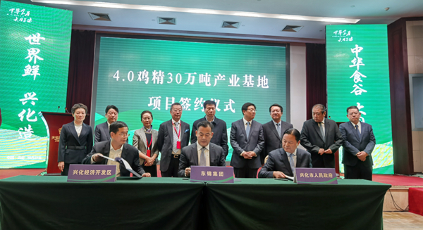 会议现场 会上,兴化市委书记叶冬华坦言,短短三年时间,集聚区从无到有、聚沙成塔,一个特色鲜明、前景广阔的产业集群已具雏形。 活动当天,兴化健康食品和调味品产业又添“新食材”:顶康、五得利面粉二期、福润等20个食品类项目开工,总投资85.6亿元;“世界鲜兴化造”东锦集团4.0鸡精30万吨产业基地项目、寰达(兴化)食品项目、四季胖哥食品物流项目、嘉豪食品产能转移项目等16个食品类项目签约,计划总投资108亿元。 在大项目好项目扎堆落户兴化的同时,安井食品、顶康食品、伽力森等重点企业竞相扩大投资,二期三期现象不断涌现。开工仪式上,顶康食品相关负责人表示,“我们在兴化投资,就是看中兴化的资源、生态等方面的优势,更重要的是当地政府的服务理念,让我们倍感亲切,让我们调味品产业找到了‘家’。”