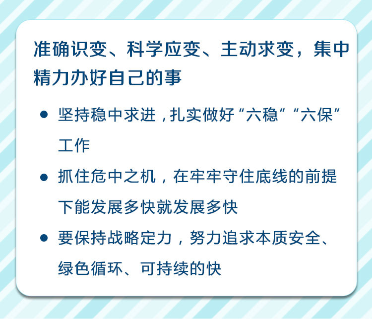 会议强调,要准确识变、科学应变、主动求变,集中精力办好自己的事,以确定的工作应对不确定的形势,以针对性的举措化解多发性的矛盾,努力在危机中育先机、于变局中开新局,确保“十三五”圆满收官、“十四五”顺利开局。一是要坚持稳中求进,保持强烈的责任感、使命感和紧迫感,慎终如始抓好常态化疫情防控,扎实做好“六稳”“六保”工作,切实以江苏的稳和进为全国大局多作贡献。特别是要在加快畅通省内、国内、东亚、国际循环上勇于进,在培育壮大新产业、新业态、新模式上勇于进,在重大前沿项目、重大创新平台、重大基础设施建设上勇于进,努力打造更多新的增长点,确保高水平全面建成小康社会,尽最大努力争取全年工作的最好成绩。二是要抓住危中之机,快马加鞭、乘势而上,在牢牢守住底线的前提下能发展多快就发展多快。省领导要发挥挂钩联系优势产业链作用,协调重大事项、推进重大项目、解决重大问题。工作专班要抓紧梳理产业链发展现状,排出重点项目和企业,研究产业链发展的配套政策。各地要呼应全省优势产业链的推进,加强协同配合,形成工作合力。三是要保持战略定力,谨防“唯GDP”思想抬头,努力追求本质安全、绿色循环、可持续的快,坚决不走老路、不走回头路。要继续以壮士断腕的勇气淘汰低端落后产能,推进沿江化工整治,优化沿江沿海生产力布局,坚定不移推进“砸笼换绿”“腾笼换鸟”“开笼引凤”,坚决打赢安全生产专项整治和污染防治攻坚战。