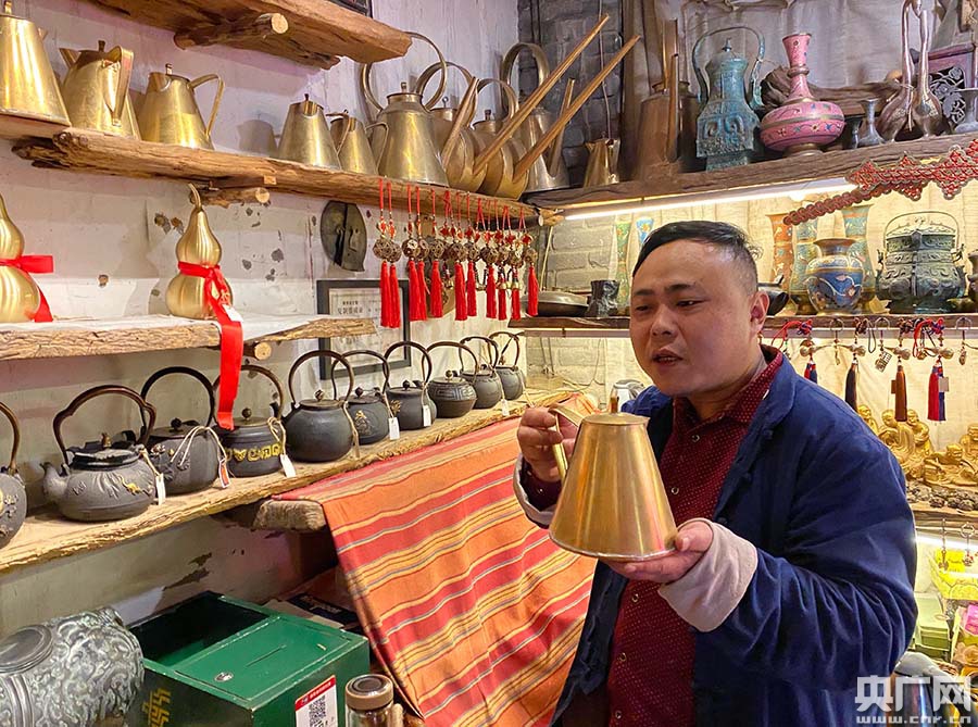 李阳阳展示自己制作的铜壶(央广网记者 郑皓月 摄) 除此之外,贫困户还可以到袁家村的商户进行就业,让贫困户有合适的岗位,有固定收入,实现稳步脱贫。烟霞镇西屯村的高勉良妻子患有小儿麻痹,没办法干重活,袁家村为高勉良提供了工作岗位。2017年在政府的帮助下盖了房子,过上了好日子。