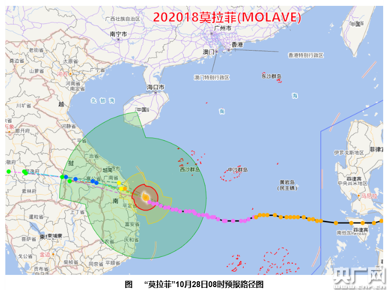 “莫拉菲”28日中午前后登陆越南28日白天海南岛陆地有强风雨天气(央广网发 海南省气象台供图) 央广网海口10月28日消息(记者许云 通讯员吴洁飞 李凡)记者今天上午从海南省气象台了解到,今年第18号台风 “莫拉菲”已于8时由强台风级减弱为台风级,8时中心位于距离越南广义东偏南方向约135公里的南海中西部海面上。预计“莫拉菲”将于28日中午前后在越南中部沿海地区登陆。预计,受“莫拉菲”和冷空气共同影响,28日白天,海南省海域和陆地有强风雨天气。请有关部门继续做好防风防雨工作。 据监测, 今年第18号台风 “莫拉菲”已于08时由强台风级减弱为台风级,08时中心位于北纬14.5度、东经109.8度,也就是距离越南广义东偏南方向约135公里的南海中西部海面上,中心附近最大风力13级(40米/秒),七级风圈半径350-500公里,十级风圈半径100-150公里,十二级风圈半径70-80公里。