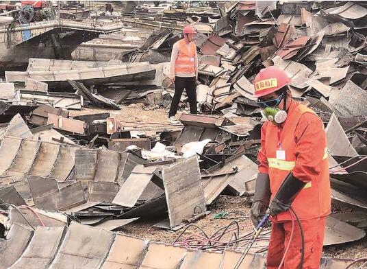 洪泽湖区泗洪濉河半城镇洪安村渔船拆解点,春阳船厂工人正在现场进行船体切割。 丁蔚文摄