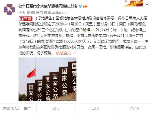 据侵华日军南京大屠杀遇难同胞纪念馆官方微博消息,因场馆筹备重要活动及设备维修需要,定于11月20日至12月13日期间闭馆。闭馆范围包括“三个必胜”展厅在内的整个场馆。12月14日起,纪念馆将正常对外开放。(杨升辉 徐红霞)
