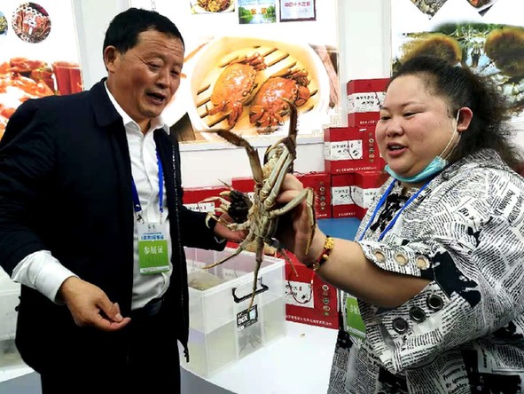 养殖大户展示洪泽湖大闸蟹 “这只螃蟹1斤3两,个大,膏肥蟹黄,是这批螃蟹中的蟹王。”在洪泽湖董大螃蟹摊位前,董大向前来选购洪泽湖大闸蟹的市民展示着他的劳动成果。董大从事养蟹已经30多年,他透露说,洪泽湖螃蟹口感好,“秘密”就在于塘口水质、蟹苗、不喂饲料有机养殖一个不能少。据了解,伴随着螃蟹养殖规模扩大,董大螃蟹养殖基地已经带动了当地200多名农户共同致富。 在农业电子商务区,7家企业为南京市民带来了银鱼、小龙虾、鱼饼等其他洪泽乡土气息农特产。这些在网上销售火爆的产品,在线下同样受到了消费者的追捧。以香辣小螺丝起家的“渔姑娘”摊位前挤满了购买手工鱼圆、鱼饼和香辣小螺丝的消费者。“渔姑娘”姓韩,是一名回乡创业的姑娘,从她自信的脸上可以看出文静的底色。她说,酷爱美食的她,当初也只是在微信朋友圈晒晒自己的香辣小螺丝,朋友们都被诱惑的流口水,纷纷要求品尝,她都爽快的给安排上。随着大家盛赞声越来越多,朋友们建议她网上开店专营,触“电”后,小韩的香辣小螺丝很快火遍网络,如今江苏渔姑娘食品科技开发有限公司产品已经涵盖到手工鱼圆、鱼饼、小龙虾等,年销售近千万元。借助电商的翅膀,“渔姑娘”把更多的洪泽农特产借助电商、网络带到全国各地。