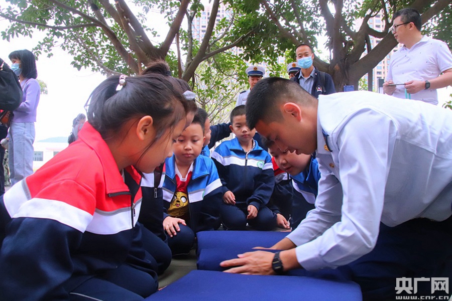 师生在观摩森林消防员叠“豆腐块”(央广网发 通讯员供图)