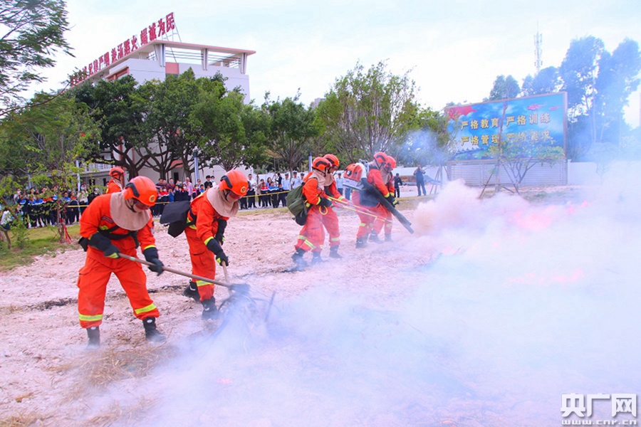 森林消防员开始班组灭火行动(央广网发 通讯员供图) 当天,师生们走进营区,先后参观了消防员宿舍、食堂、灭火救援装备、班组灭火战斗和队列表演。在灭火装备区,师生们拿起风力灭火机、电动水枪和高压细水雾,在消防指战员的讲解下进行体验。在模拟火场上班组灭火战斗环节,只见消防员们首先利用风速90米/秒的风力灭火机吹散堆积的可燃物,然后用电动水枪进行降温、保湿作业,防止林火再复燃,并仔细清扫烟点。指战员们配合默契,引来师生们的热烈掌声。