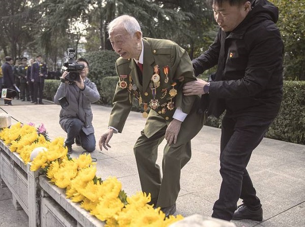 11月29日,是中国人民志愿军特等功臣、特级战斗英雄杨根思烈士牺牲70周年纪念日。泰兴市杨根思烈士陵园,天地静默,松柏肃穆。 “老连长,我来看您了。”杨根思烈士衣冠冢前,90岁高龄的杨德盛手捧鲜花,热泪盈眶,言语哽咽。70年前,杨根思作为志愿军第20军58师172团3连连长,奔赴抗美援朝战场。老家泰县的杨德盛,是杨根思生前老战友,这是他第九次来看“老连长”。杨德盛清楚地记得,解放上海时,他与杨根思相识,被杨根思称作“小老乡”。至今,老人依然记得老连长留给他的最后一句话“别给我丢脸,别当孬种啊!” “老连长牺牲时,我离他只有100多米,远远地就看到了火光。”站在烈士陵园广场,老人又一次回忆起当时的情景:1950年11月29日,当敌人向阵地发起第九次进攻时,杨根思命令通讯员把重伤员背下阵地,又命令机枪手把打光子弹的重机枪撤下阵地,自己孤身一人留下坚持战斗。打出最后一颗子弹后,他埋伏在高地上,当美国兵快到山顶时,他抱起一个炸药包,拉响导火索,冲向敌群,与40多个敌人同归于尽。 老连长生前的照顾和嘱托,令杨德盛此生难忘。这次老人和儿子杨根宝一起从成都回到泰州,将珍藏的从朝鲜战场缴获的美制迫击炮照明弹和炸药桶捐给杨根思烈士陵园。杨根宝说,为了缅怀老连长,父亲特意给他取名“杨根宝”,巧的是他的生日就是11月29日。迫击炮照明弹和炸药桶一直被父亲珍藏在家中,与军功章、军服等放在一起,从不准他触碰。“现在把它们放在泰兴,是为了教育后代,让他们不忘记历史。”杨德盛说。(赵晓勇 张建荣 赵留锋 程 鹏 顾继红 张建荣) |