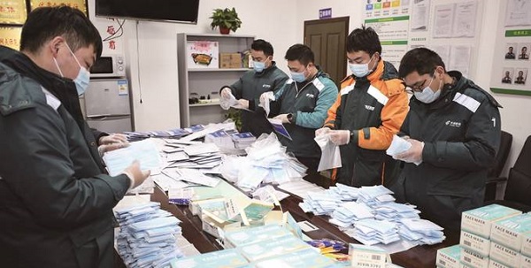 疫情防控期间,淮安邮政快递工作人员分装平价口罩。