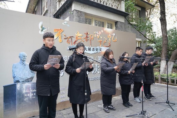 南京大学拉贝纪念馆暨拉贝国际和平与冲突化解研究交流中心主任杨善友讲解 来自南京工程学院的大学生读书会成员朗诵了诗歌《拉贝的诉说》。