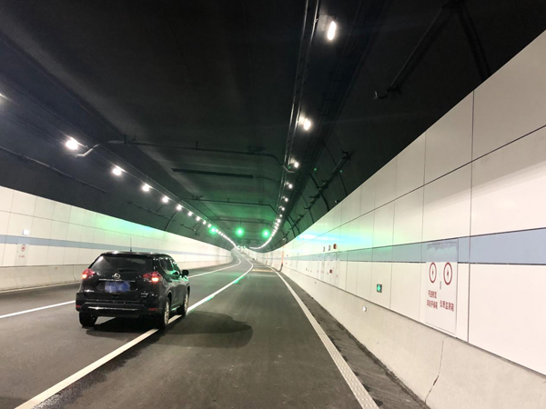 长江五桥夹江隧道(庞雪汀 摄) 在正式建成通车之后,长江五桥夹江隧道还将与南京应天大街隧道、定淮门隧道实施一体化运营管理,建设一体化指挥调度平台和管养信息化系统,各通道应急救援力量将相互调配、互为补充。 此外,在长江五桥隧道内,充满人性化的智慧措施随处可见。隧道桥面上的横向条纹,分为黄色和蓝色两种。当车辆开过时,如果墙壁侧面的条纹显示蓝色,就代表经过长江水段,黄色则代表经过陆地交通段。隧道内还将全程覆盖5G信号,即使隧道内暂时发生拥堵,市民也可以安心驾车,不用担心无法通过网络查看前方路线或与外界联系。