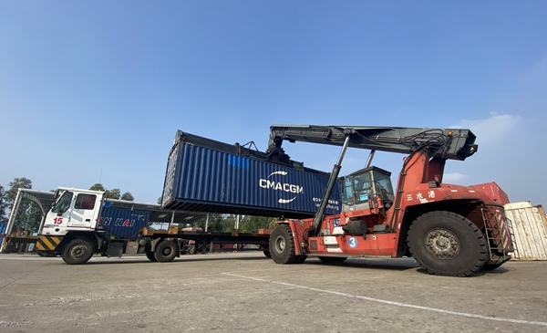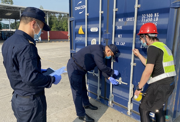 图为广州海关所属佛山海关驻三水办事处关员对退运固体废物进行核对箱体和加封海关关封 (央广网发 赖珏冰摄)