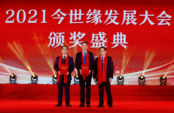 今世缘酒业党委书记、董事长周素明为“十三五”功勋颁奖(席航飞 摄) 活动现场颁发了今世缘2020年“优秀合作伙伴奖”“精诚合作奖”“卓越合作伙伴”“十三五”功勋,今世缘“结善缘”爱心大使,“缘梦公益之星”等奖项。同时,还举办了《今世缘·等着我》特别节目、《今世缘·等着我》爱心纪念酒发布及公益义卖,“缘梦基金”捐款仪式等活动。