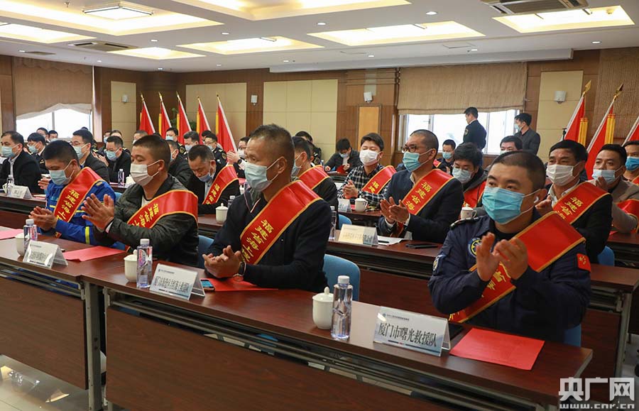 表彰会现场(央广网发 福建海事供图) 会上特别表彰了两名杰出代表:一是2019年10月6日,“嘉良1”轮在台湾海峡南部海域突遇大风浪翻覆沉没,船上13名船员遇险。附近作业的渔船“闽东渔61165”在漳州市海上搜救中心协调下,全速赶往遇险海域,克服恶劣气象条件展开救助,第一时间将13名落水人员全部救起,获得2019年度国家海上搜救奖励福建省最高奖金4万元;第二是厦门市曙光救援队作为全省人数最多的海上搜救志愿者队伍,长期坚持海上搜救工作,2019年成功开展近岸救援21起,营救22人,有效保障了厦门滨海旅游区水上安全形势稳定,获福建省海上搜救奖励最高奖金3万元。
