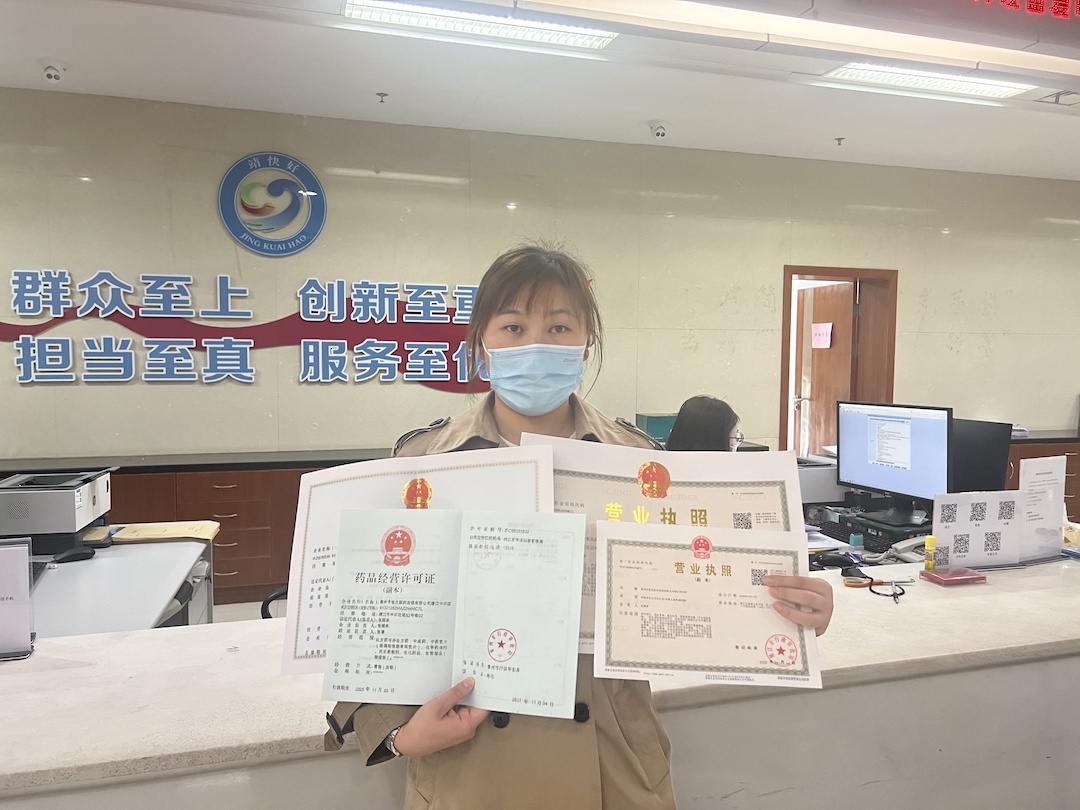 ▲同时领取营业执照和药品经营许可证 据介绍,靖江市的企业开办专区“证照联办”服务专窗,提供营业执照和涉企经营许可事项的咨询、辅导、受理、发证服务,通过优化流程,实现减跑动、减环节、减材料、减时限,填补准入准营的政务服务空白地带,进一步降低市场准入制度性成本。“证照联办”服务专窗目前涉及药品、医疗器械、娱乐场所、网吧、出版物、印刷等10个高频事项的设立、变更、注销。