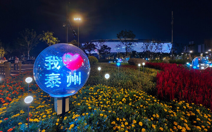 人民广场作为“城市大客厅”,是群众休闲娱乐健身的重要场所。泰州市对这里的灯光布景进行了精心策划和重点打造,在确保安全节能、自然和谐、色温适度、舒适温馨、绿色环保等前提下,运用投光灯、洗墙灯、媒体柱、图案灯等,充分展示梅花之韵、凤凰展翅、梦里水乡、泛黄银杏等泰州特色景观,彰显古韵泰州之美;运用科技环保的可控投影灯,让光影艺术生动表达,展示活力泰州之美。