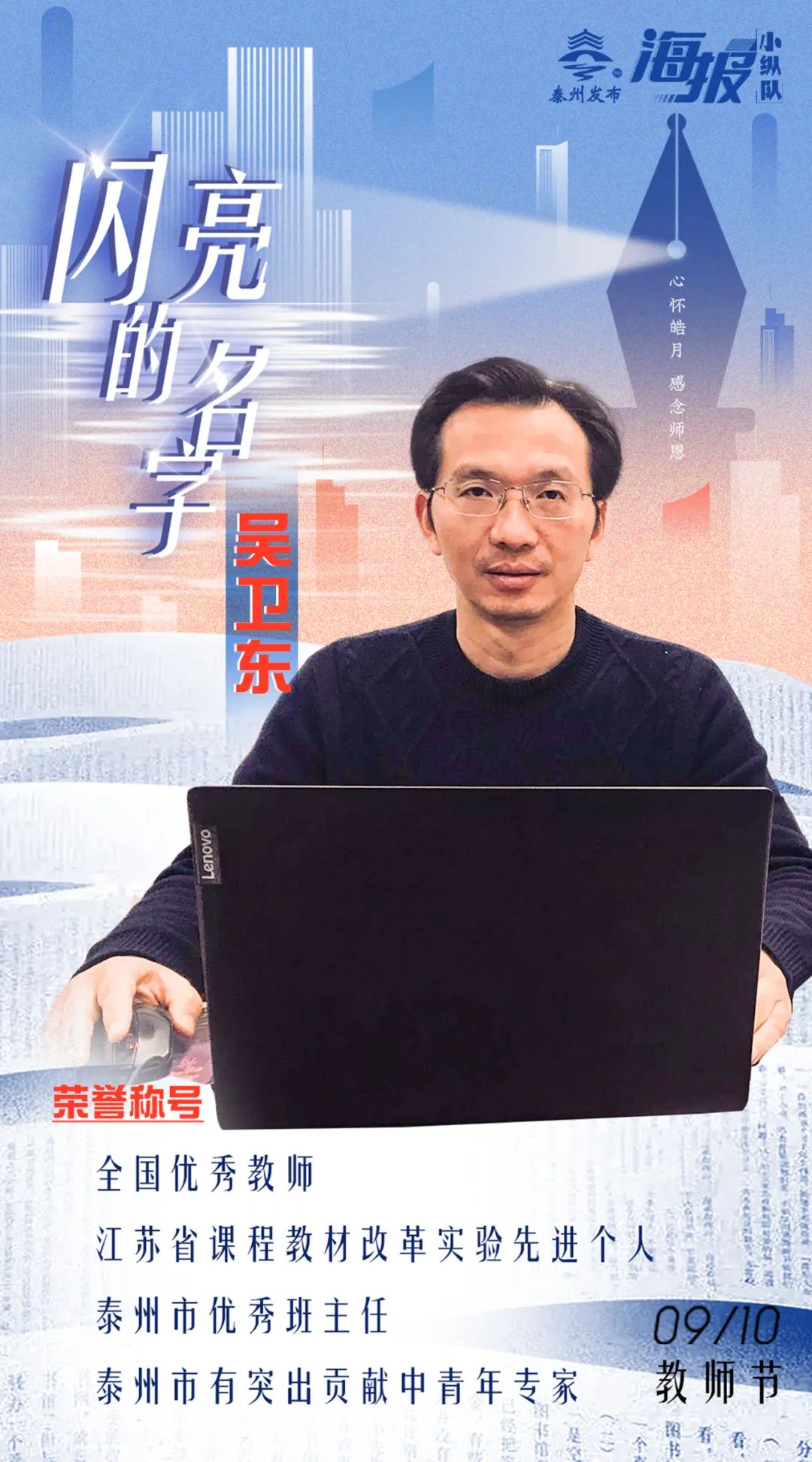 现为江苏省泰兴中学副校长。用情关爱学生,做有温度的教育,是吴卫东一直以来的教学理念。他热爱教育、热爱学生,用真情去看待对待每一位学生,正因此,触动了学生们内心最柔软之处,才有了他这充满温情、温暖、温度的教育之路。“吴老师的数学课,改变了传统授课的枯燥、繁琐和死板的状态,他的课堂充满了探索情趣。学生上课时非常有积极性,成绩也提高了不少。”这是吴老师的一位学生对他课堂的评价。“一个人可以走得很快,但一群人才可以走得更远。”这是他在班级管理中经常说的一句话。在他的带领下,班里同学们互帮互助、同心同德,共同塑造了良好的班风。 TEACHER'S DAY