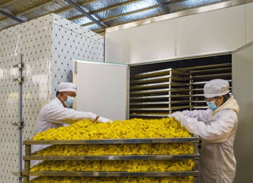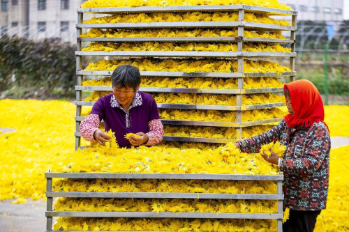 今年夏季,当地农民在收获油菜后种植了450亩的婺源皇菊和金丝皇菊。村民们穿梭在“花海”之中,趁着晴好天气采摘成熟的花朵,再进行烘烤、销售,田间地头一派繁忙的丰收景象。 |