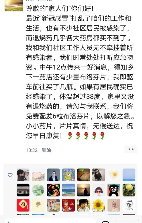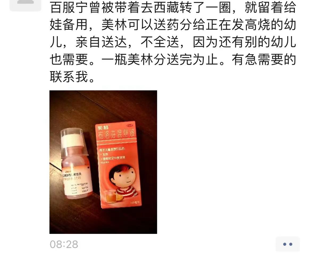 “百服宁曾被带着去西藏转了一圈,就留着给娃备用,美林可以送药分给正在发高烧有需要的幼儿,不全送,因为还有别的幼儿也需要。一瓶美林分送完为止。有急需要的联系我。”12月19日上午,市民朱红在微信朋友圈发布了一条药品“共享”信息。上午11时许,市民陈女士(化名)便联系上朱红,表示家中有人需要几粒布洛芬。了解情况后,朱红和陈女士约定好地点,并把4颗布洛芬药片包装好,再放在约定地点的花坛上,陈女士取完药后再离开,全程保持无接触状态。