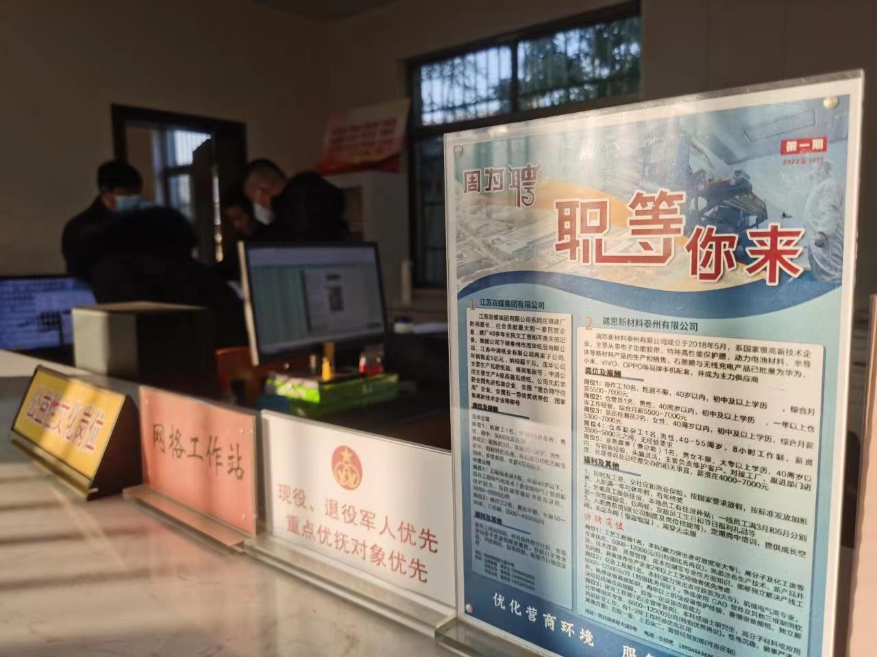 “趁着大伙回老家过年,我也串串门、打打电话,看看有没有想在老家工作的。”史春龙打开电脑里的统计表格,姓名、性别、手机号码、基本情况等信息一目了然。在她的办公桌前,摆放着一块企业招工宣传牌。去年10月至今,她已成功帮助6位村民在本镇找到合适工作。 除了兴化市周庄镇周泽村结报员外,史春龙目前还有一个身份——村“招聘专员”。像她这样的“招聘专员”,如今在周庄镇18个行政村每个村都有。