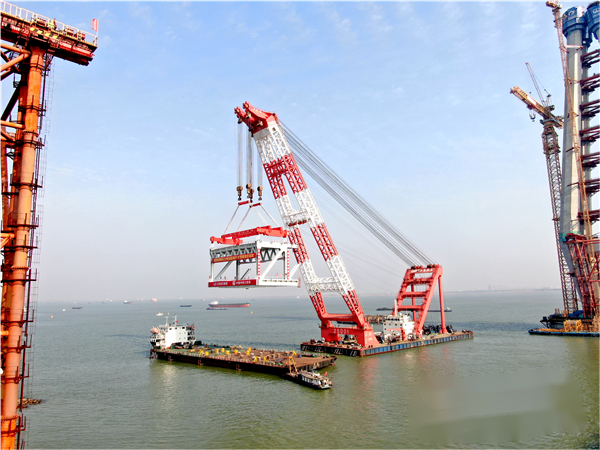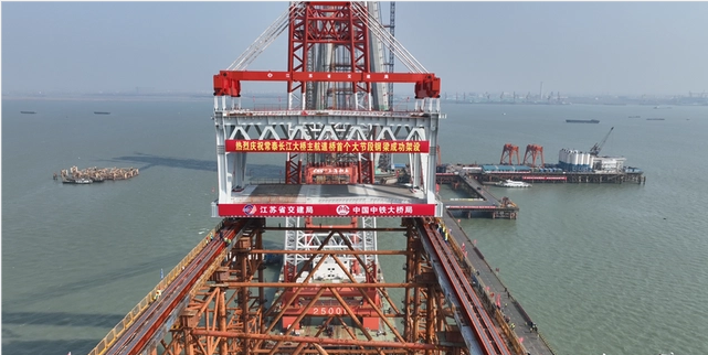 常泰长江大桥是在建最大跨径公铁两用斜拉桥,大桥集三种过江方式于一体,上层为六车道高速公路,下层分别设置为双向城际铁路和四车道普通公路。大桥于2019年1月9日开工,工期预计为5年半。建成后,泰州人到常州至少可节省半小时车程。大桥主航道桥采用双主桁“N”形钢桁梁,桁高15.5米,桁中心间距35米。全桥共有91个大节段,每个节段长14米-28米,重约900吨—1856吨。整节段钢桁梁在工厂制造完成后通过水路运至桥位处整体吊装架设。 据了解,首次吊装的大节段钢桁梁位于常州侧边跨。1月30日,从数十公里外的如皋江边,将长22米、重1280吨的首段钢梁装船完毕,这座相当于850部小轿车重的铁家伙逆江而上,经过半天的水路运输到达常泰长江大桥施工现场。 将动辄上千吨的钢梁节段吊装于高耸的支架上,这相当于在空中吊起约160头成年非洲象。而且两桁拖拉同步误差要控制在5毫米以内,这对施工精度控制提出了很高要求。同时,主航道桥常州侧边跨和辅助跨要跨越陆地、江滩、深水三种环境,河床覆盖层为硬塑粉质黏土,施工的水域狭小,流速大,潮差可达1.5米左右,这使得作业船只面临走锚风险。