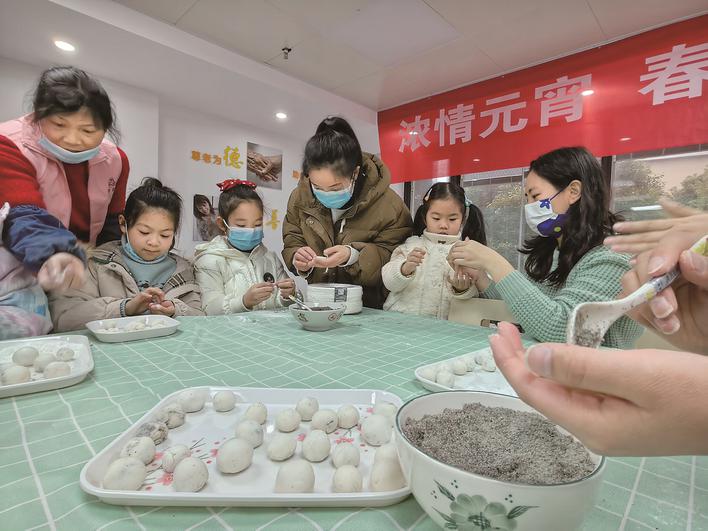 听完故事,大家动手做起元宵花灯。吉祥红兔灯、大耳兔灯、萌兔投影灯、新年投影走马灯……在志愿者老师和家长的指导陪伴下,小朋友们制作的一盏盏别致的花灯呈现眼前。大家提着花灯彼此送上诚挚祝福,开心的笑容洋溢在每个人的脸上。 象征合家团圆美满的汤圆,是元宵节最具特色和代表性的食物。当天,东城社区的居民们围坐一起,和面、包馅儿、搓汤圆、煮汤圆……不一会儿,一碗碗香甜可口的汤圆就出锅了。10岁的于悦和妈妈一同来参加活动,包完一份汤圆后,她说:“我想把我包的汤圆煮给妈妈吃,告诉她我长大了,可以帮妈妈分担一些了。”听到女儿的话,妈妈曹凤兰欣慰地笑了。