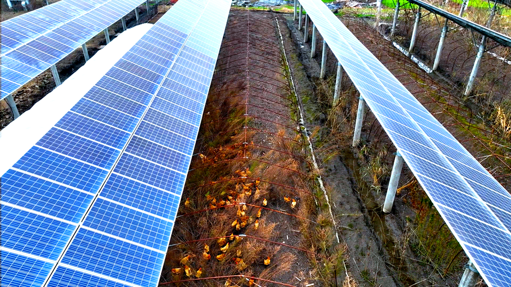 光伏电站除了发电还能做什么?在泰州市海陵区罡杨镇纯垛村,一排排光伏板依垛傍水,不断提供着绿色能源,而两千多只“飞鸡”在光伏板下自由生长,成为当地的特色农产品。