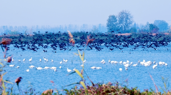 果然如沈永干所说,游船开了半个小时,登上八公山后,徐马荒的生态景观尽收眼底,而远远望去,芦苇丛上盘旋的鸟儿黑压压一大片,休息时停在树上,光秃秃的树上仿佛瞬间长满了黑色的叶子,凌空翱翔时,成群结队的黑色大军编织成一块飘逸的黑幕,遮天蔽日般尽情地撒欢,宣示着对天空的主权。
