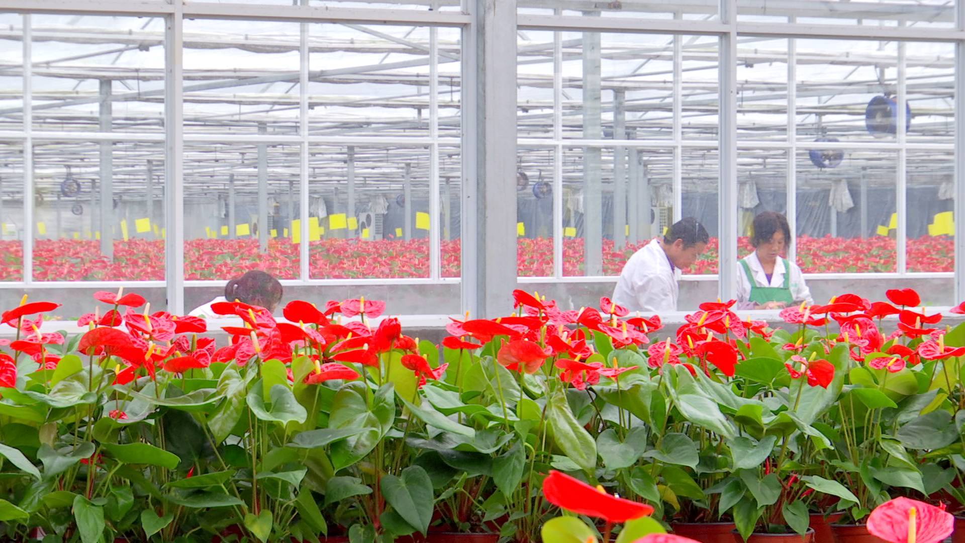 据了解,整个大棚配备了从国外引进的环控、温控、水净化、自动配肥施肥系统,全过程实现湿度、温度、光照、营养液配方智能化控制。在现代技术的帮助下,红掌的生长状态、环境变化等信息都可以轻松获取,一株株红掌枝干茁壮、叶片葱绿。每月四万盆红掌从这里“走”出,销往长三角地区。“我是罡门村人,几年前从部队退役,想着做点实业。”周笙,这位“新农人”说道,“后来,我们选中了花卉项目,综合考虑交通因素和各种政策支持,我们最终决定落户在罡门村。” 高科技带来高品质。从2017年投资以来,他们的红掌产业越做越大,合作的经销商也遍布周边城市。周笙说:“后期,我们会提升红掌的品质,使它株型更饱满,颜色更艳丽。我们也在研究水培红掌,准备扩建三期、四期项目,把花卉产业进一步越大。”