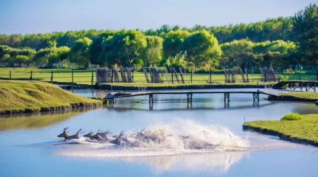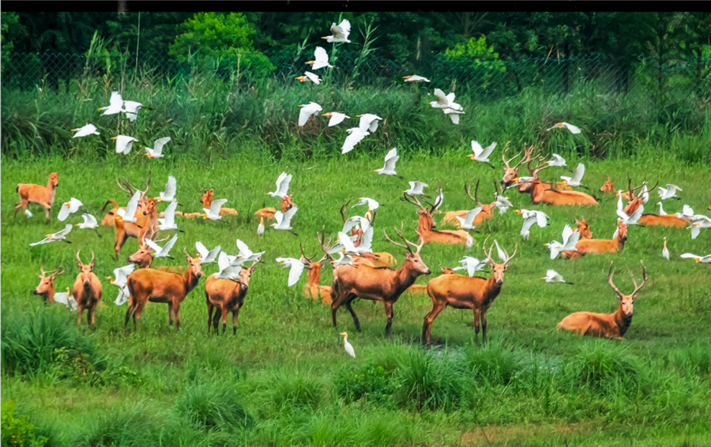 喜欢热闹的鸳鸯、野鸭等水鸟在溱湖水面上“呼朋唤友”来相聚,习惯独居的糜鹿不受打扰地在水中倘徉,黑体天鹅在水中争抢觅食,白鹇则警觉地伸颈四顾……这画面美得让人心醉,吸引了众多游客背着相机来“打卡”。在生物多样性国际日到来之际,记者走进溱湖湿地,印入眼帘的是一幕幕人与自然和谐共生的生动图景。