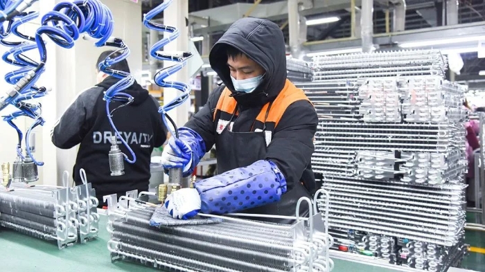 作为海陵智慧家电产业链的链主企业,2022年乐金电子实现工业开票销售93亿元,“链”起本地配套企业突破30家,产业链规模超150亿元,其中17家已成为规上企业,涵盖主控板、电机、压塑机零部件等产品,产业链条完整。 蒸发器和冷凝器是空调、冰箱等制冷设备中的重要部件。位于海陵工业园区的泰州仕达利恩电子有限公司是一家韩国独资企业,主要生产销售片式元器件、光电子器件及冰箱零配件。步入生产车间,产品通过传送带送到每个工序,一条生产线近30名工作人员配合默契。“我们目前有13条生产线,年产蒸发器冷凝器500万套。2022年,企业实现工业开票销售4.89亿元。”公司管理部科长朴成介绍。