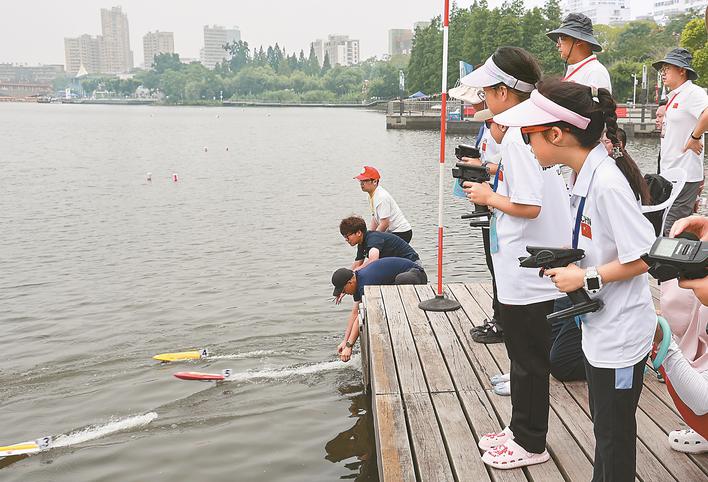 7月21日上午,在泰州市凤城河双拥广场亲水平台水域,只见英姿飒爽的少年们凭借熟练的操控技巧,一艘艘模型船艇在水面上风驰电掣,演绎着水上的“速度与激情”。这是2023年“丝路信使杯”江苏省青少年航海模型锦标赛的现场。