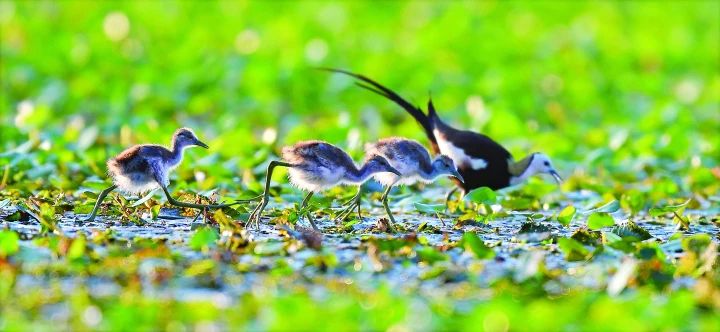 “这些鸟宝宝的出生得益于社会各界的保护。”王万才是兴化资深鸟友,先后拍摄本地鸟类近百种。7月15日,王万才在乌巾荡湿地公园拍鸟时,发现公园工人正在用机械船打捞水草,而附近区域的水草上有11只水雉在活动,其中两巢水雉在孵蛋,一只雄鸟带着四只出壳不久的幼鸟在觅食,两对水雉成鸟正在“踩背”。 “这里是水雉繁殖区,水草上的水雉鸟巢如果被破坏,刚孵出的幼鸟也将不保,机械船打捞水草的作业应该立即停止。”王万才赶紧在朋友圈发了个视频。泰州环境监测中心生物多样性监测人员孙海涛了解到相关信息后,第一时间联系兴化市生态环境局,说明情况和事发地具体位置,要求该局紧急联系公园管理部门暂停水草打捞作业,并建议将水草打捞时间推迟到水鸟繁殖期过后。 4至9月份,是水草生长茂盛期,腐烂的水草会对水质产生不利影响,而打捞水草又不同程度影响了鸟类繁殖。兴化乌巾荡湿地公园听取生态环境部门的建议,立即暂停水草打捞工作,并推迟打捞时间20多天,避开鸟类繁殖期。在公园施工作业时,采取科学的打捞方案,既控制水草无限制生长,防止影响水质,又尽量避开鸟巢,保持安全距离,为鸟儿营造安全舒适的繁育环境。
